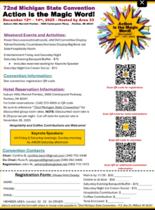 Auburn Hills Marriott Pontiac 3600 Centerpoint Parkway Pontiac, MI 48341 Hotel reservations: (248) 253-9800 - reference "72nd Michigan State Convention" Contacts: Chair: Cynthia B. (248) 752-0448 Co-Chair: Russ. R (586) 662-0406 Registration: John W. (586) 719-7472![]()