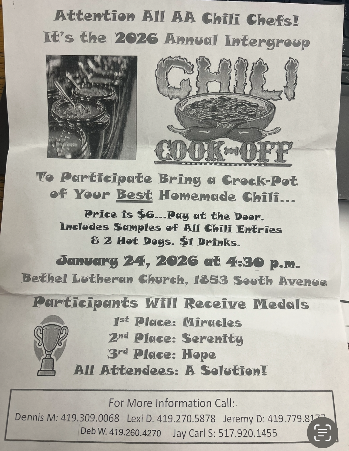 Bethel Lutheran Church 1853 South Avenue, Toledo Begins at 4:30 pm Praticipants bring a crock pot of your best Homemade Chili Price is $6, pay at the door Includes samples of all Chili entries & 2 hot dogs $1 drinks available Participants will receive medals More info: Dennis M - 419-260-4270 Jeremy D - 419-779-8177 Deb W. 419-260-4270 Jay Carl S. - 517-920-1455