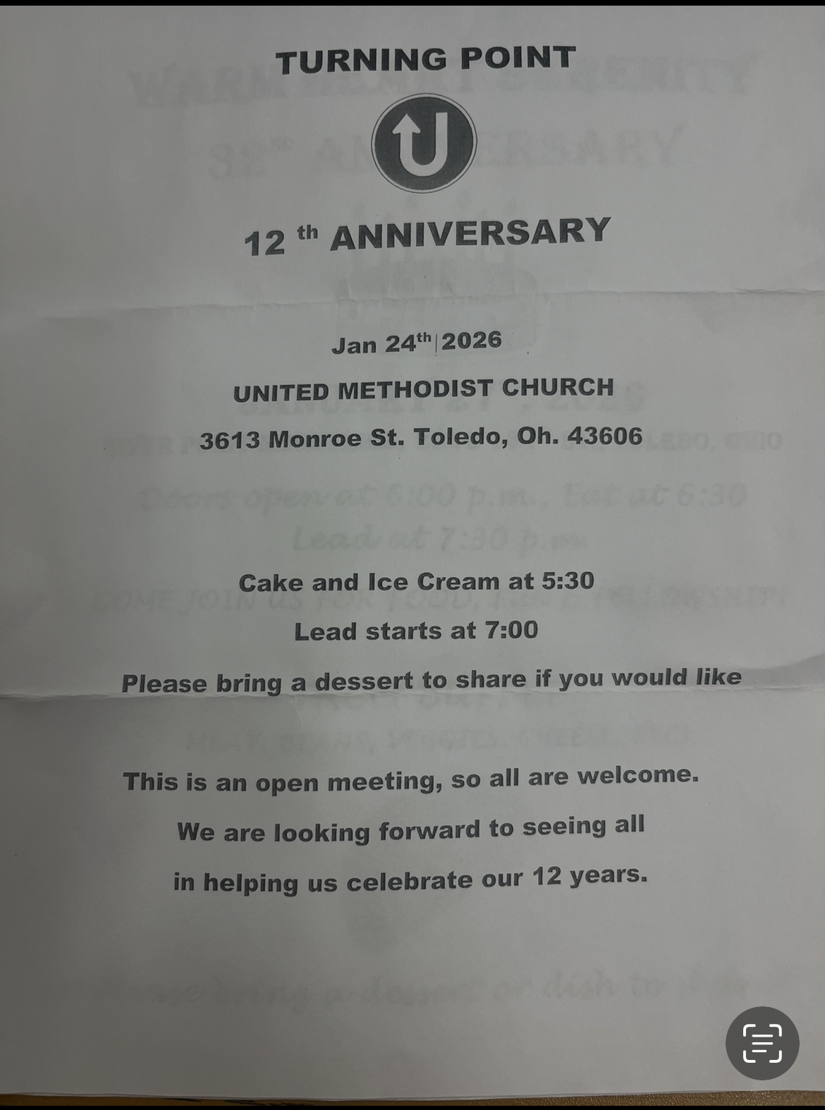 United Methodist Church 3613 Monroe St., Toledo Cake and Ice cream served at 5:30 pm Lead starts at 7:00 pm Please bring a dessert to share if you would like This is an open meeting all are welcome