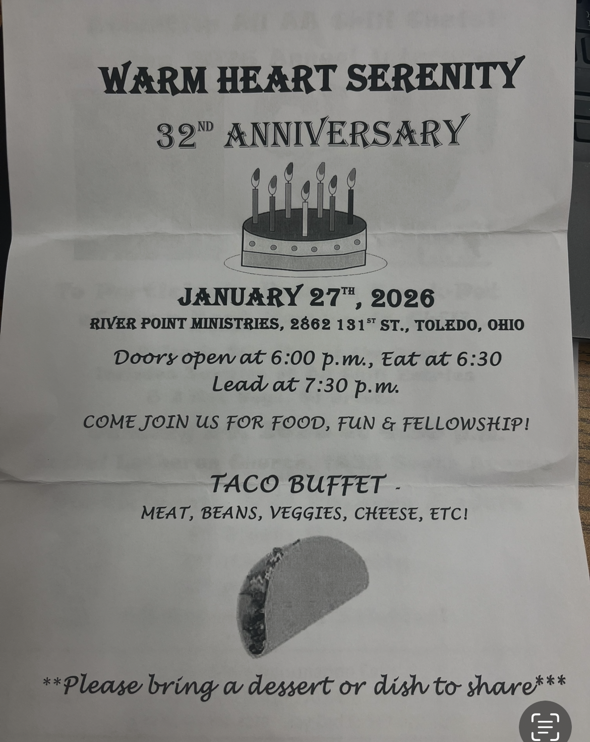 River Point Ministeries 2862 131st St. Toledo Doors open at 6:00 pm Eat at 6:30 pm Lead at 7:30 pm Taco Buffet Please bring a dish to pass![]()